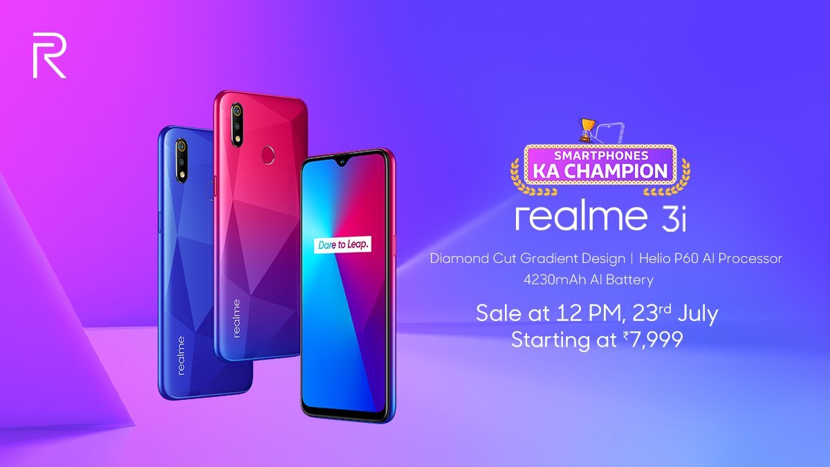 Realme 3i will be available in Diamond Black, Diamond Blue, and Diamond Red color options. The handset is priced at Rs. 7,999 for 3GB + 32GB variant while the 4GB + 64GB priced at Rs.9,999. The first sale will be starting from 12 PM on 23rd of July via Flipkart.